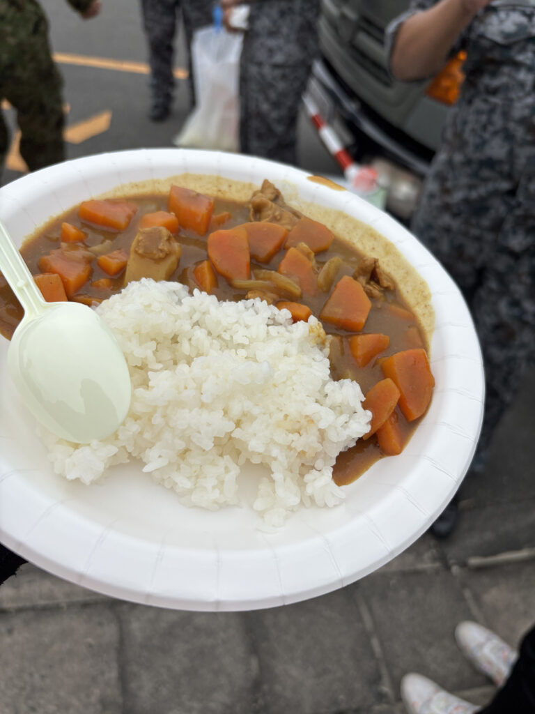 また、他にも自衛隊の方々が準備した炊き出しや野外入浴セットを基に、試食や体験が行われました。
